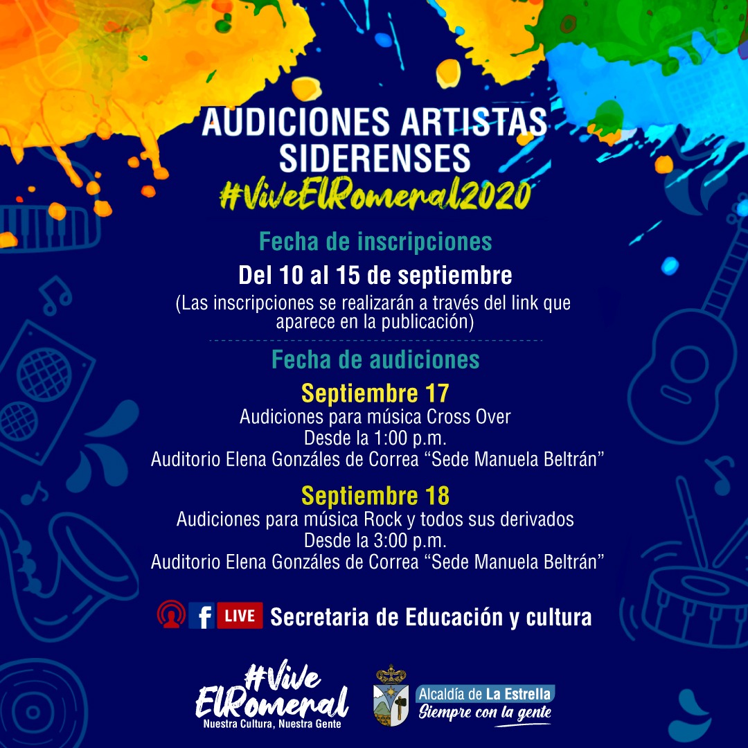 Si tu talento es la música, eres solista o tienes un grupo que quiera participar en la celebración #ViveElRomeral, es la oportunidad de inscribirte para realizar las audiciones; las cuales están ya aprobadas por medio de la resolución 00926.