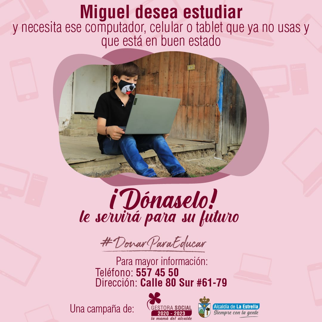La Gestora Social del municipio de La Estrella, Olgalú, emprende un proyecto que sin duda podrá cambiar el futuro educativo de muchos niños y niñas siderenses. Donar para Educar, es la campaña que recibirá computadores, celulares y tablet en buen estado para ayudar a estudiantes de Instituciones Públicas de este municipio, que aún no cuentan con estas herramientas para su desarrollo educativo.