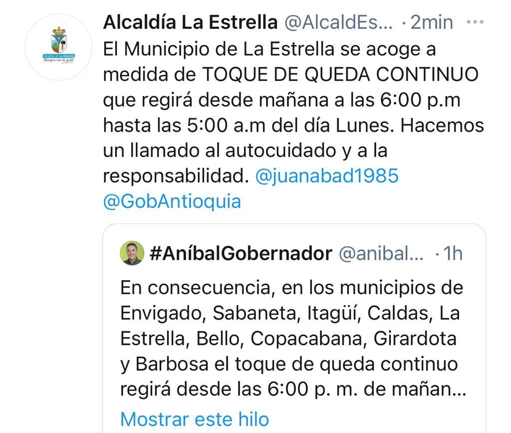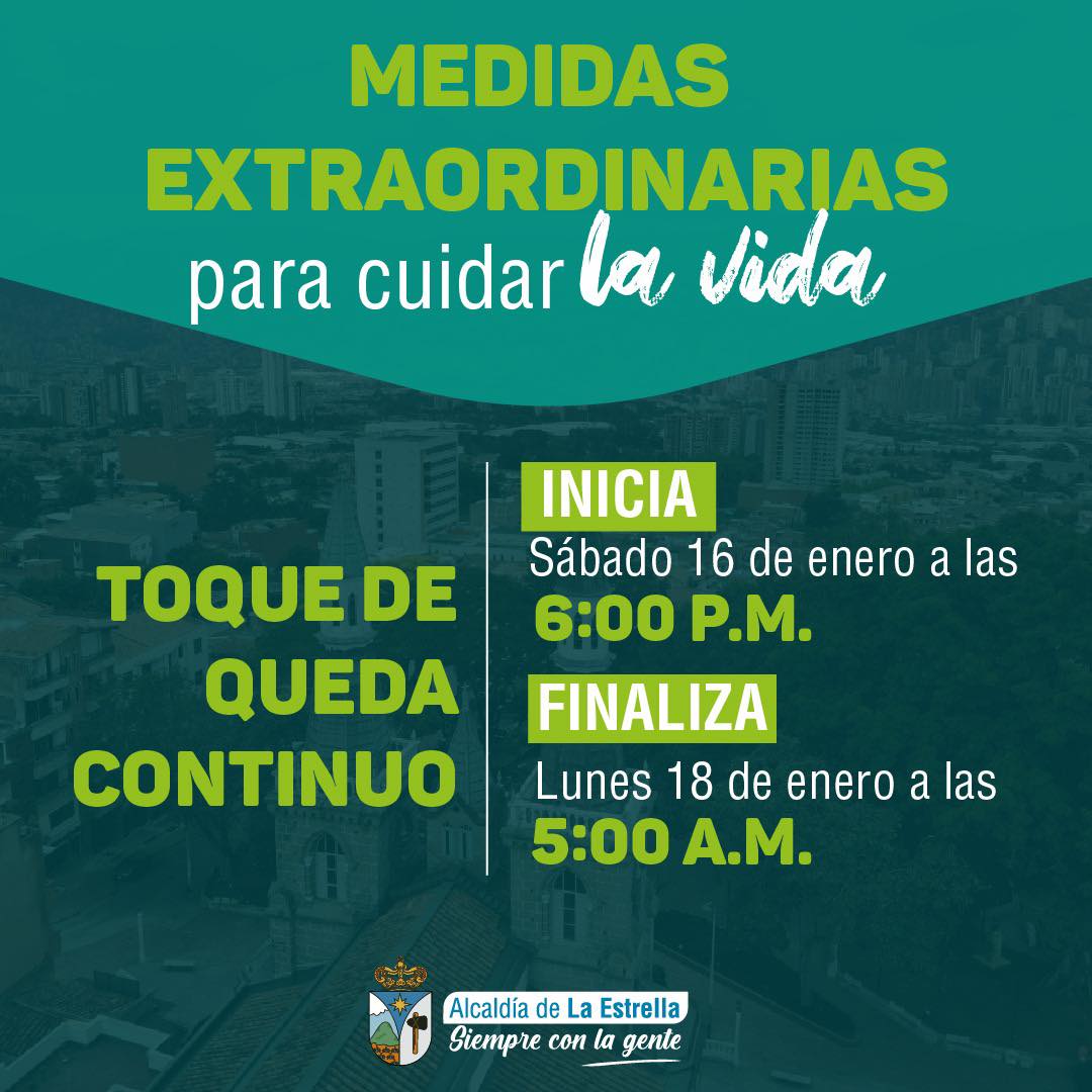 Nos acogemos a las medidas decretas por la Gobernación de Antioquia, Toque de queda continuo, de la siguiente manera: