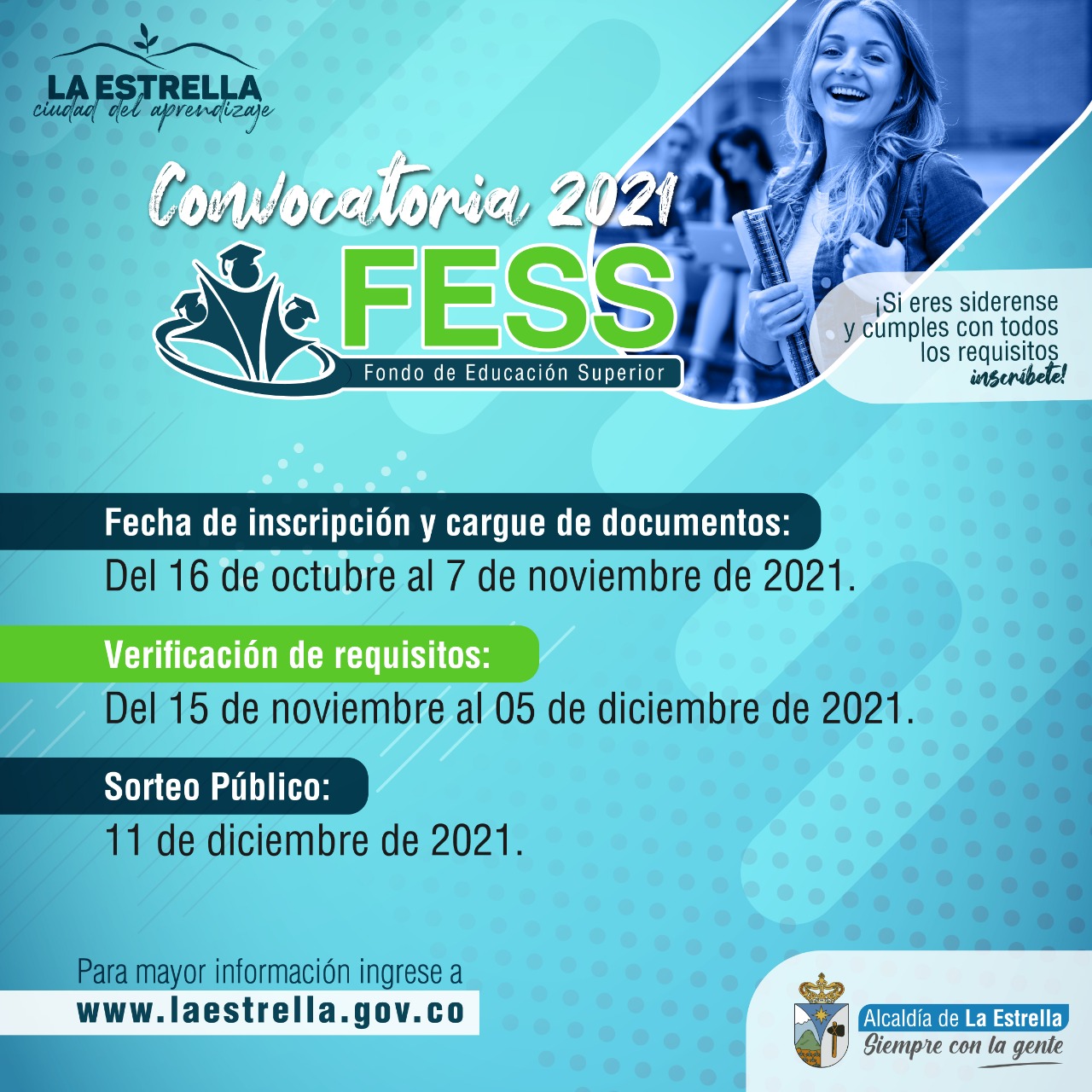 Con el fin de garantizar el acceso y la permanencia de la educación superior de los jóvenes del municipio de La Estrella, la convocatoria para acceder a créditos condonables del Fondo de Educación Superior para los Siderenses - FESS 2021, se llevarán a cabo a partir del 16 de octubre del presente año y hasta el 7 de noviembre del mismo, donde se podrá financiar semestralmente hasta cuatro (4) SMMLV.