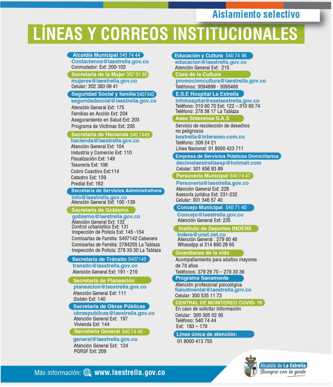 En esta época de contingencia queremos poner a disposición de la comunidad las siguientes líneas de atención que se encuentran en funcionamiento tanto en la Administración Municipal, entes descentralizados y demás líneas que están dispuestas paar atender el COVID-19.