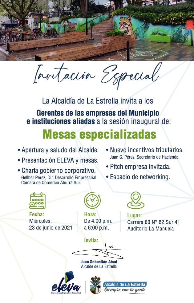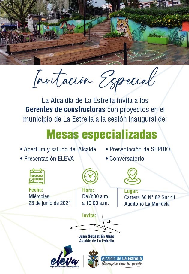 Las mesas especializadas contarán con dos espacios, en la mañana se reunirán los gerentes de constructoras que tengan proyectos en el municipio y en la tarde los gerentes de las empresas del municipio e instituciones aliadas, a quienes se les presentarán los programas Eleva y SEPBIO, se realizará un conversatorio y se generarán espacios de networking, adicional a esto se les contará sobre los nuevos incentivos tributarios para las empresas.