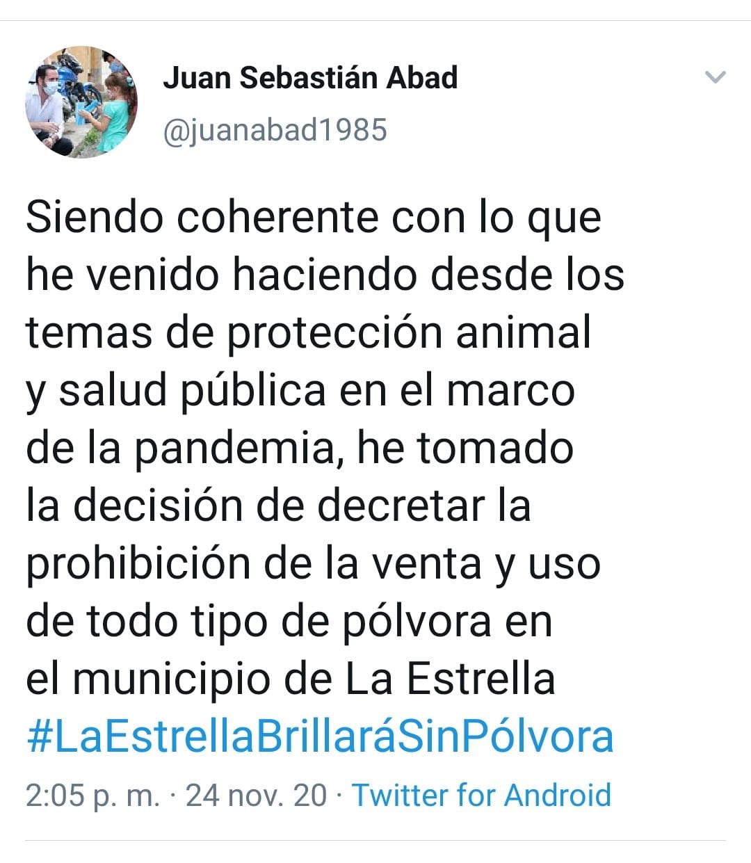 El alcalde del municipio de La Estrella Juan Sebastián Abad firmará este jueves 26 de noviembre a las 2:30 de la tarde, el decreto en donde se prohíbe la comercialización y el uso de todo tipo de pólvora en la jurisdicción de este municipio.