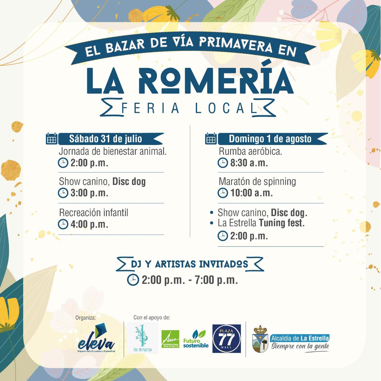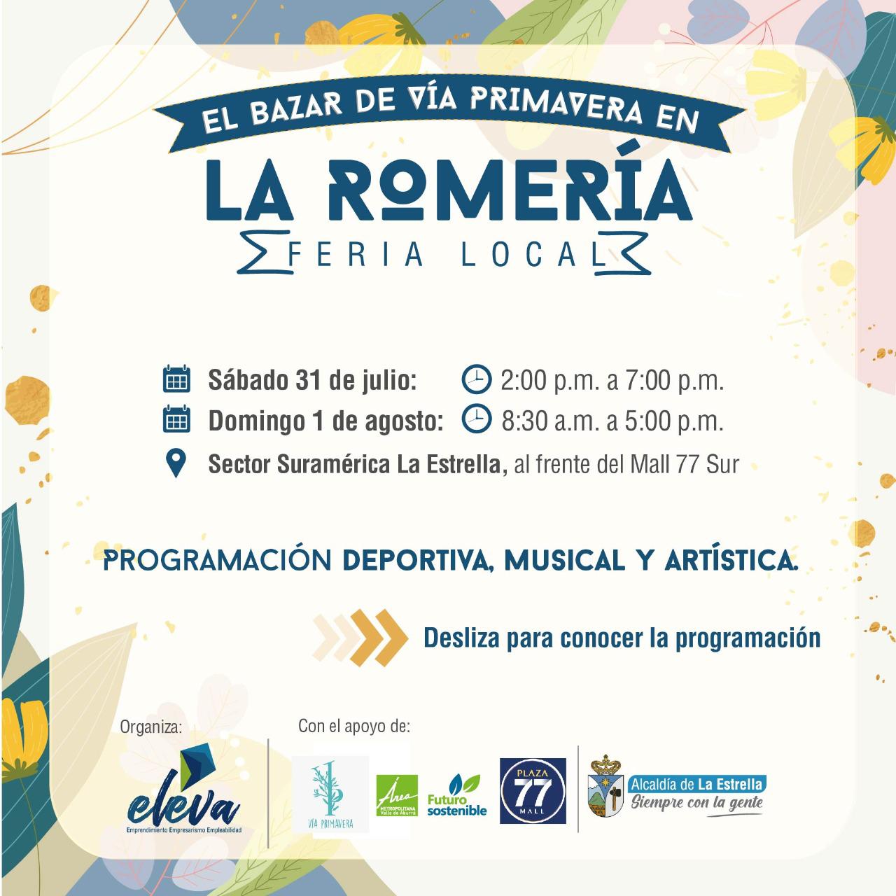 Este sábado 31 de julio y domingo 1 de agosto se llevará a cabo La Romería feria local en el sector de Suramérica, con el apoyo del Área Metropolitana, un espacio deportivo, cultural y comercial donde se encontrarán productos de más de 30 emprendedores, empresarios y comerciantes de Caldas, Sabaneta, Itagüí, Envigado, Medellín y La Estrella, donde también hará parte el Bazar de Vía Primavera.
