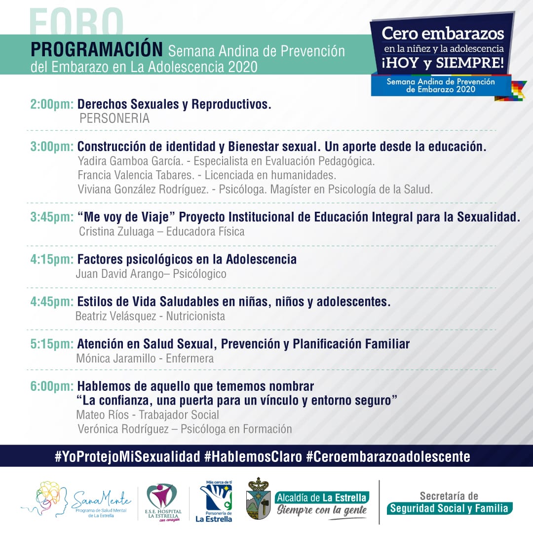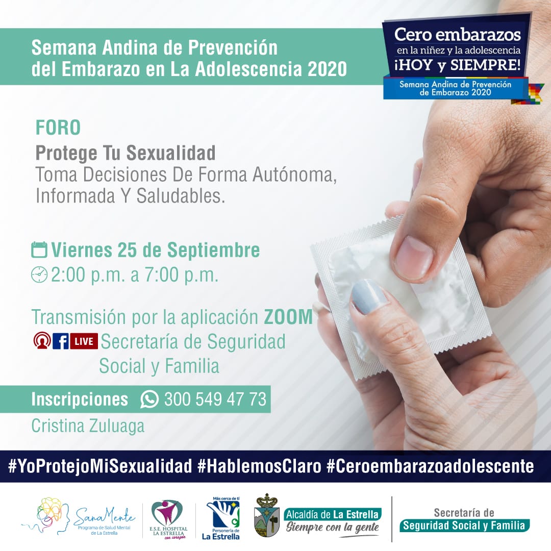 En un trabajo que se realiza de forma articulada entre la Personería Municipal, la E.S.E Hospital La Estrella y las Comisarías de Familia, se realizará el foro “Protege tu sexualidad” que será transmitido a través de la aplicación zoom, y la Fan Page de la Secretaría de Seguridad Social y Familia, allí se busca promover el diálogo y búsqueda de estrategias de transformación, en temas de salud sexual y reproductiva para minimizar y erradicar los embarazos a temprana edad.